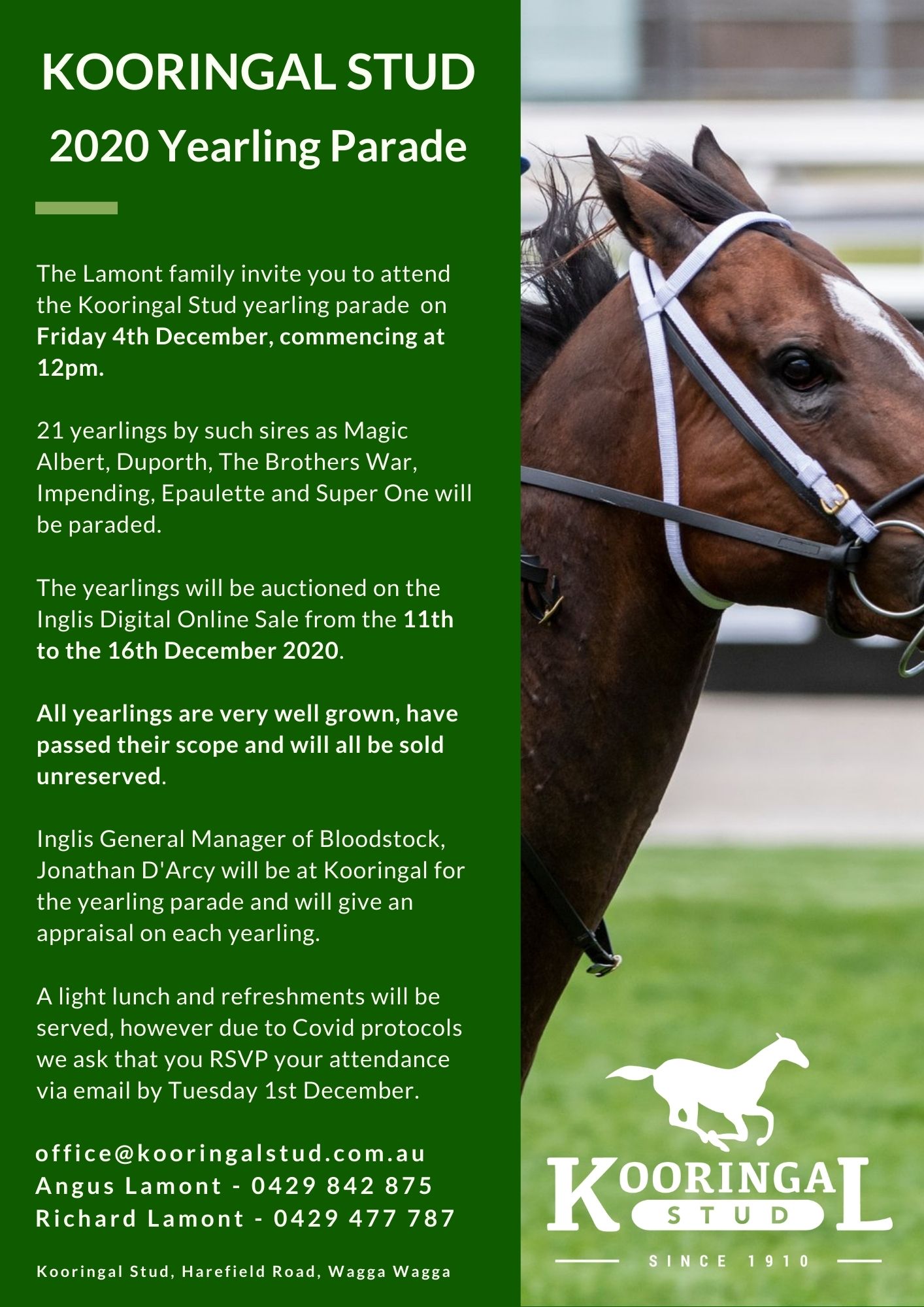 Kooringal Stud has available an online brochure for its yearling parade which will be held on Friday (December 4)
